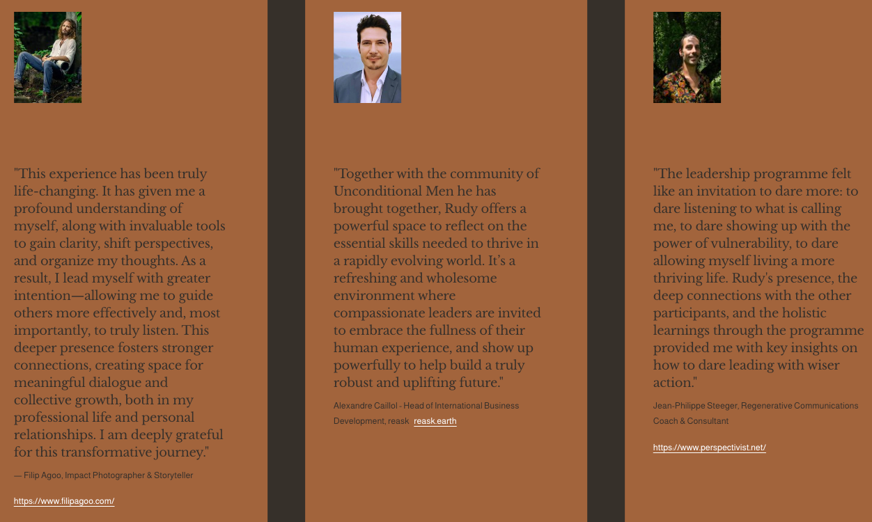 Unlike traditional men’s leadership programs focusing primarily on performance, career, or external leadership skills, Unconditional Men starts from the inside. It invites men (and those who lead with a balanced masculine and feminine energy) to explore the inner terrain of emotions, belief systems, and identity as a pathway to lead with integrity and regenerative impact.